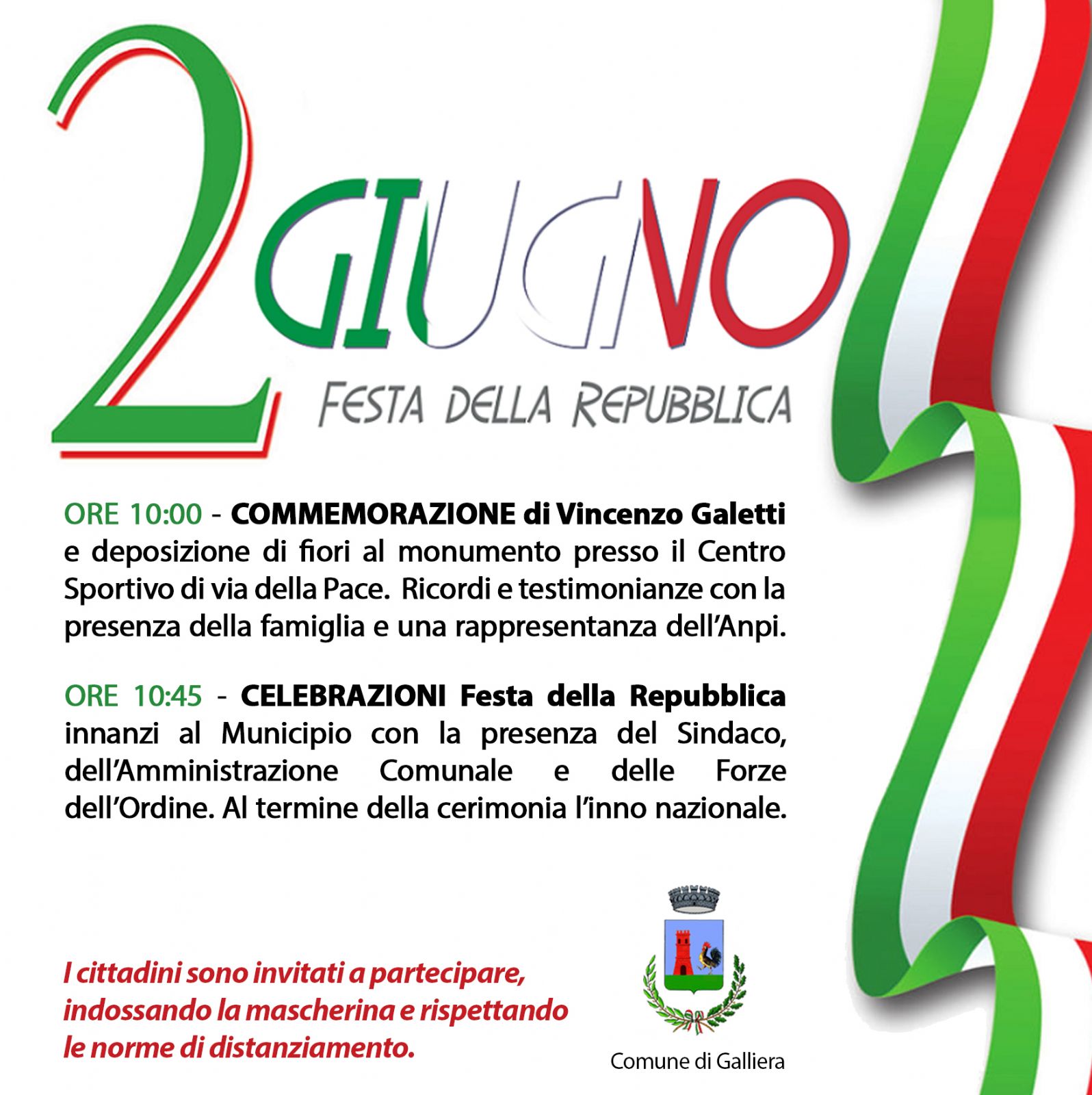 ORE 10:45 - CELEBRAZIONI Festa della Repubblica innanzi al Municipio con la presenza del Sindaco, dell’Amministrazione Comunale e delle Forze dell’Ordine. Al termine della cerimonia l’inno nazionale.