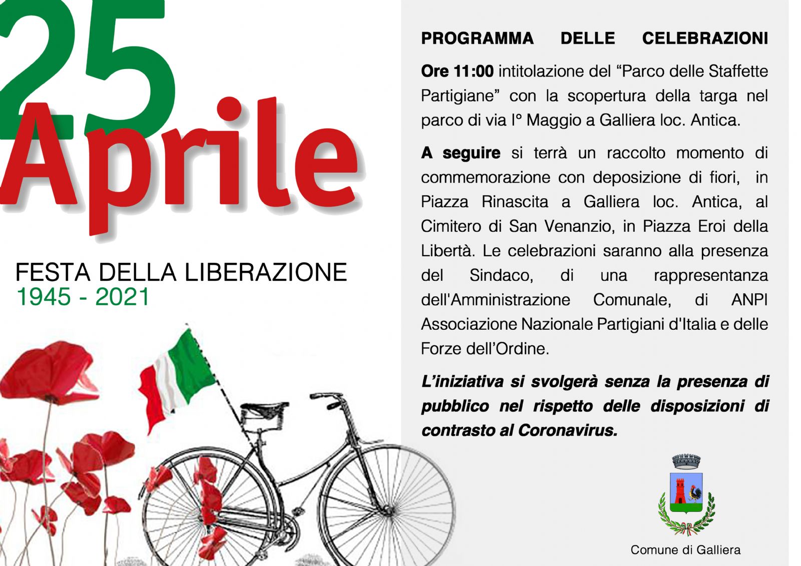 A seguire si terrà un raccolto momento di commemorazione con deposizione di fiori, in Piazza Rinascita a Galliera loc. Antica, al Cimitero di San Venanzio, in Piazza Eroi della Libertà. Le celebrazioni saranno alla presenza del Sindaco, di una rappresentanza dell'Amministrazione Comunale, di ANPI Associazione Nazionale Partigiani d'Italia e delle Forze dell’Ordine.