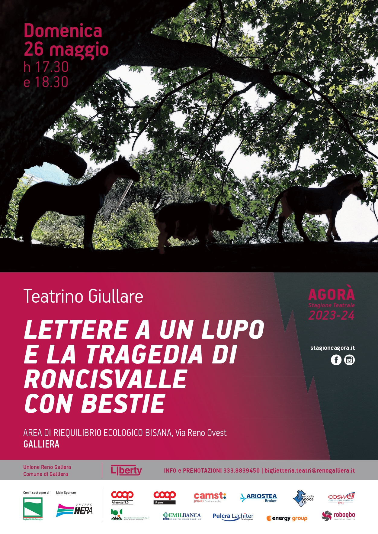 La stagione teatrale Agorà 2023-2024 ha inizio il 30 settembre 2023 e si concluderà il 26 maggio 2024 presso l'AREA DI RIEQUILIBRIO ECOLOGICO BISANA a Galliera con