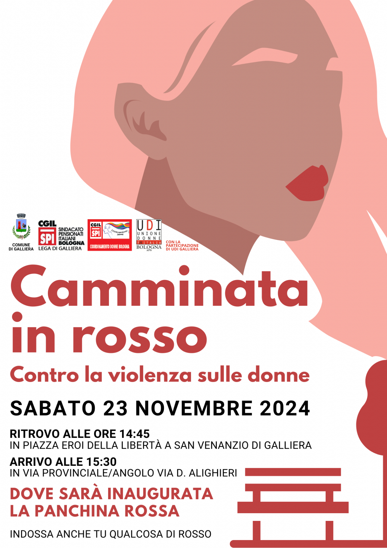 Sabato 23 novembre 2024 il Comune di Galliera, in Collaborazione con SPI CGIL Galliera, Coordinamento Donne e UDI, vi invita a partecipare alla “Camminata in rosso” organizzata in occasione della Giornata internazionale per l'eliminazione della violenza contro le donne: