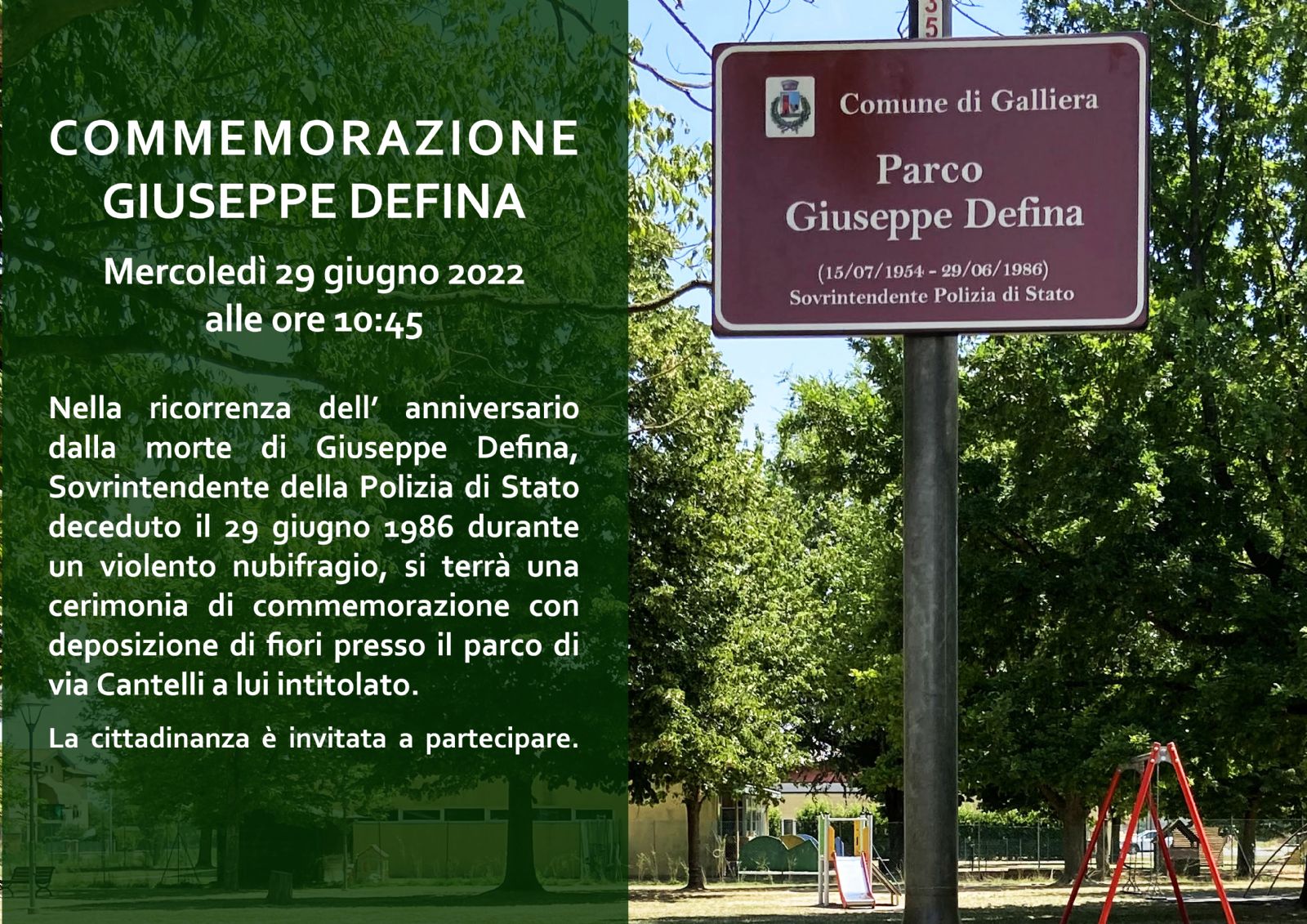Nella ricorrenza dell’ anniversario dalla morte di Giuseppe Defina, Sovrintendente della Polizia di Stato deceduto il 29 giugno 1986 durante un violento nubifragio, si terrà una cerimonia di commemorazione con deposizione di fiori presso il parco di via Cantelli a lui intitolato.