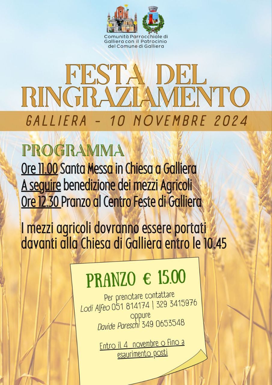 Si terrà Domenica 10 Novembre 2024 a Galliera loc. Antica la Festa del Ringraziamento, con la Santa Messa alle 11.00 e a seguire la benedizione dei mezzi agricoli.