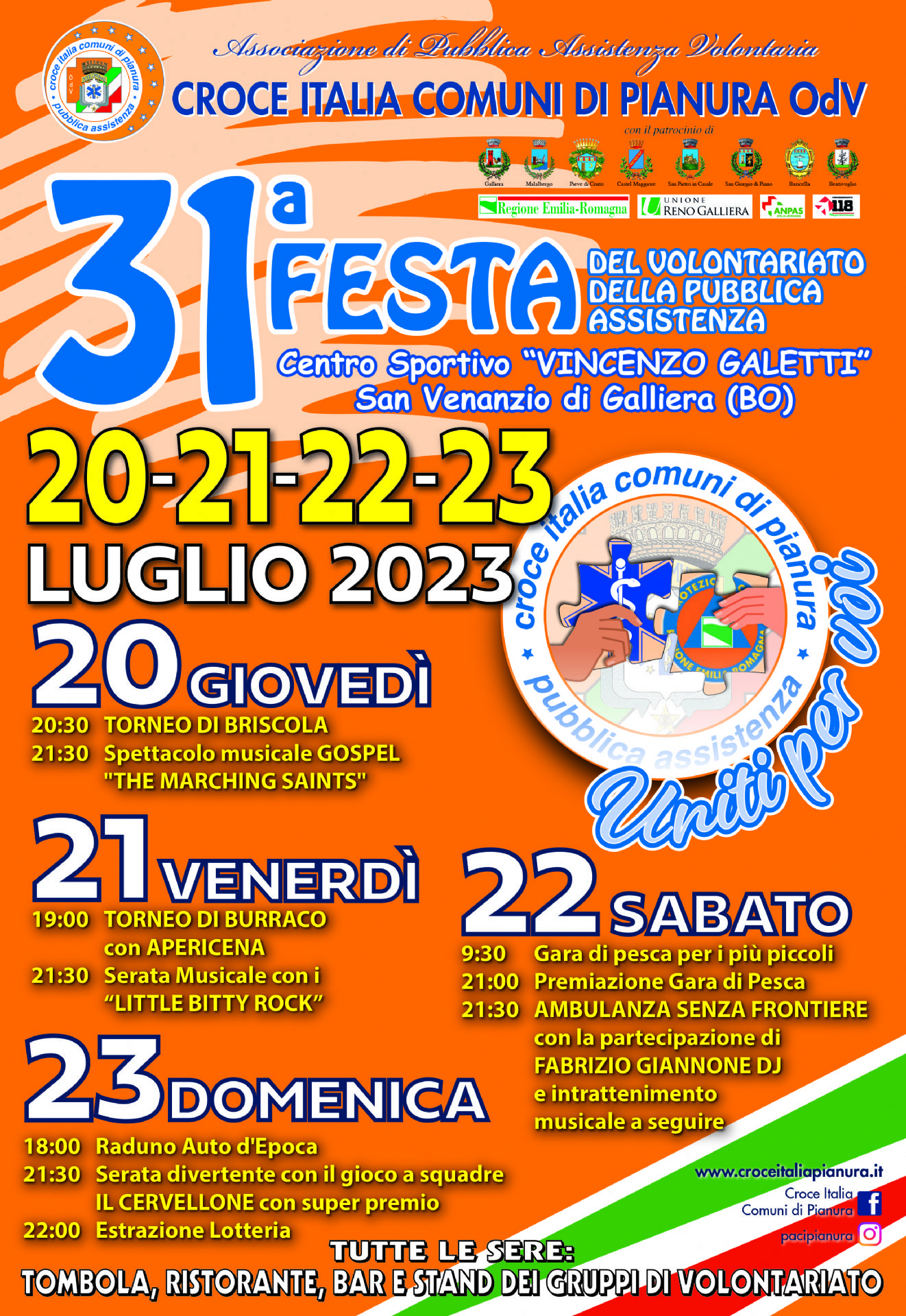 Tutte le sere ristornate e bar, intrattenimento, spettacoli tombola, stand dei gruppi di volontariato e tanto divertimento per una giusta causa: sostenere Croce Italia Comuni di Pianura.