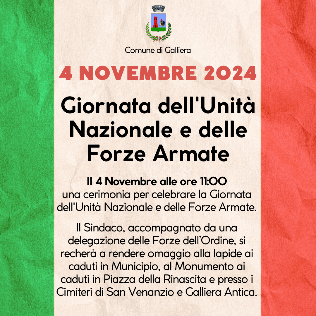Il 4 Novembre alle ore 11:00 si terrà una cerimonia per celebrare la Giornata dell'Unità Nazionale e delle Forze Armate.