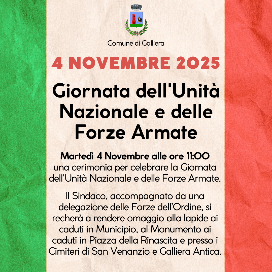 Martedì 4 Novembre si terrà una cerimonia per celebrare la Giornata dell'Unità Nazionale e delle Forze Armate.