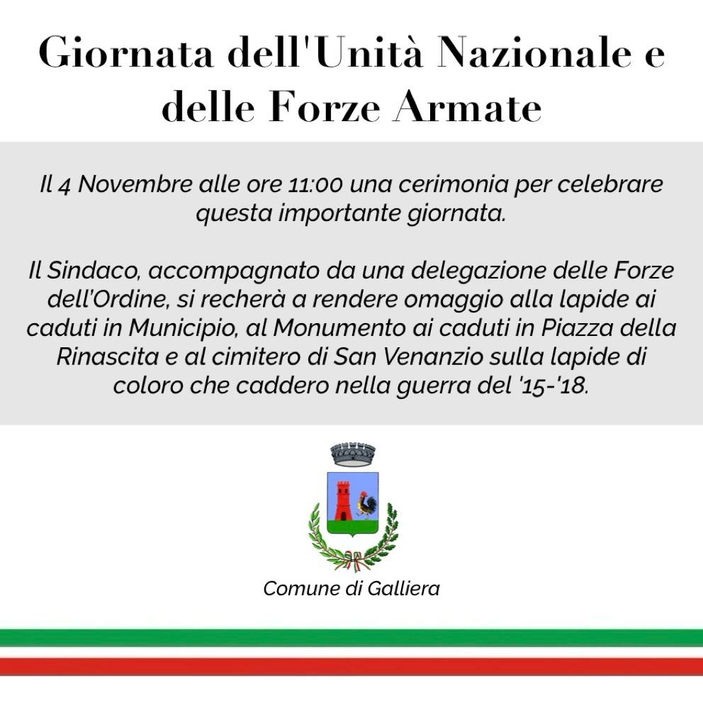 Il 4 Novembre alle ore 11:00 una cerimonia per celebrare la Giornata dell'Unità Nazionale e delle Forze Armate.