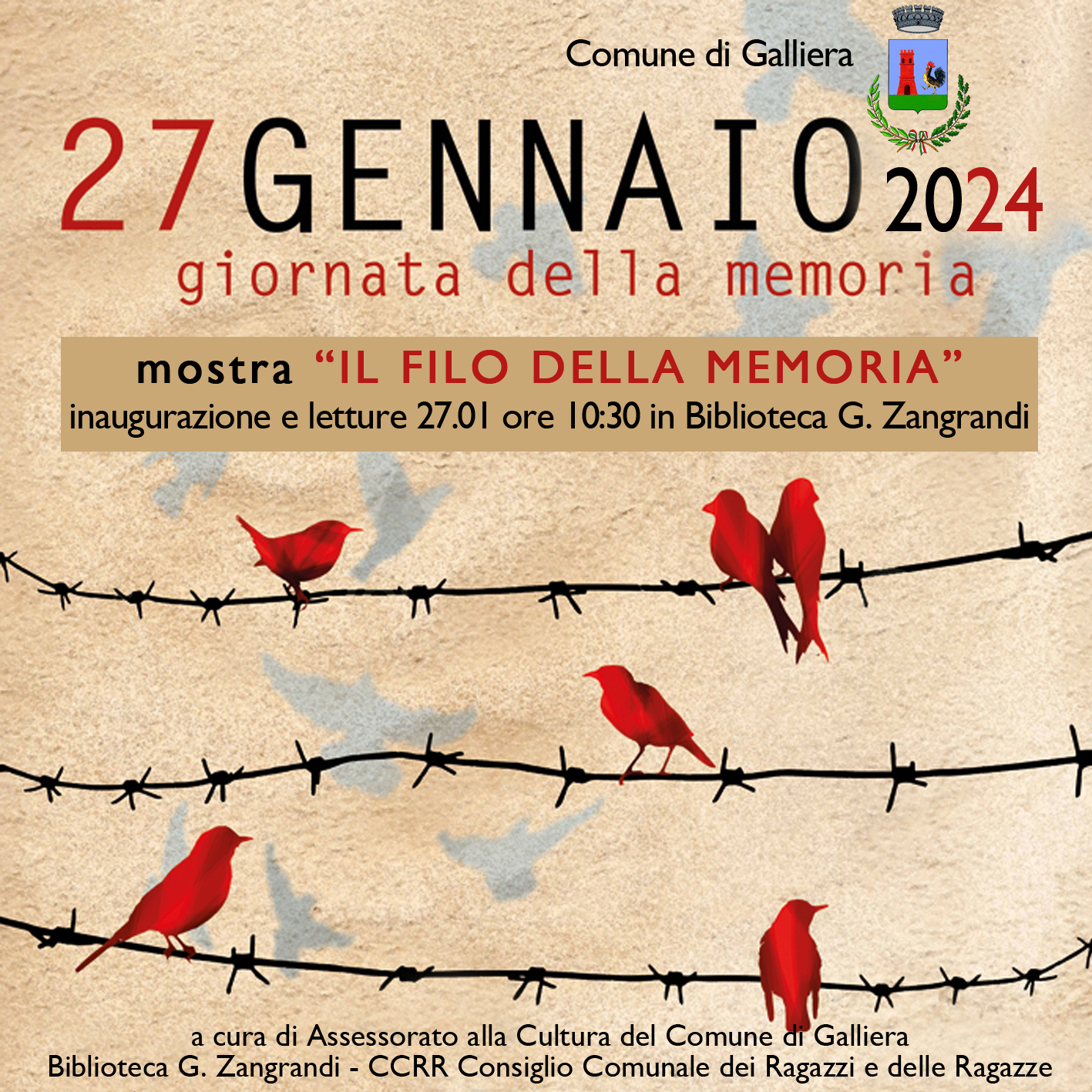 Sabato 27 Gennaio 2024 alle ore 10:30 in Biblioteca G. Zangrandi, via della Pace 2 – San Venanzio di Galliera, l’inaugurazione della mostra “Il filo della Memoria” e letture a cura di Assessorato alla Cultura del Comune di Galliera, Biblioteca G. Zangrandi, Consiglio Comunale dei Ragazzi e delle Ragazze.