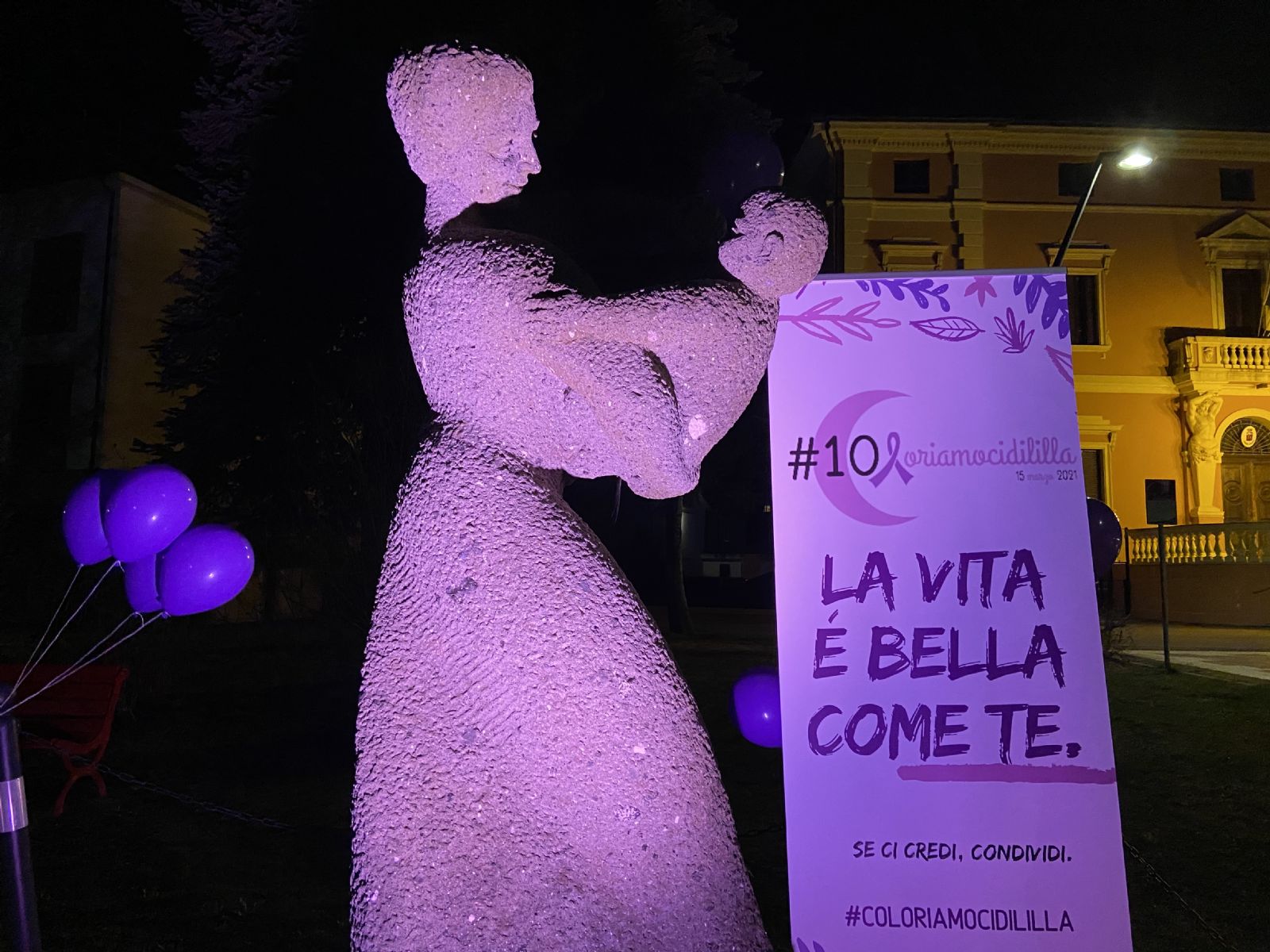 Il COMUNE DI GALLEIRA ha illuminato di lilla e circondato di palloncini la scultura DONNA MATER di Mazzacurati nella piazza del Municipio per sensibilizzare su questa tematica così delicata che colpisce soprattutto i giovani.