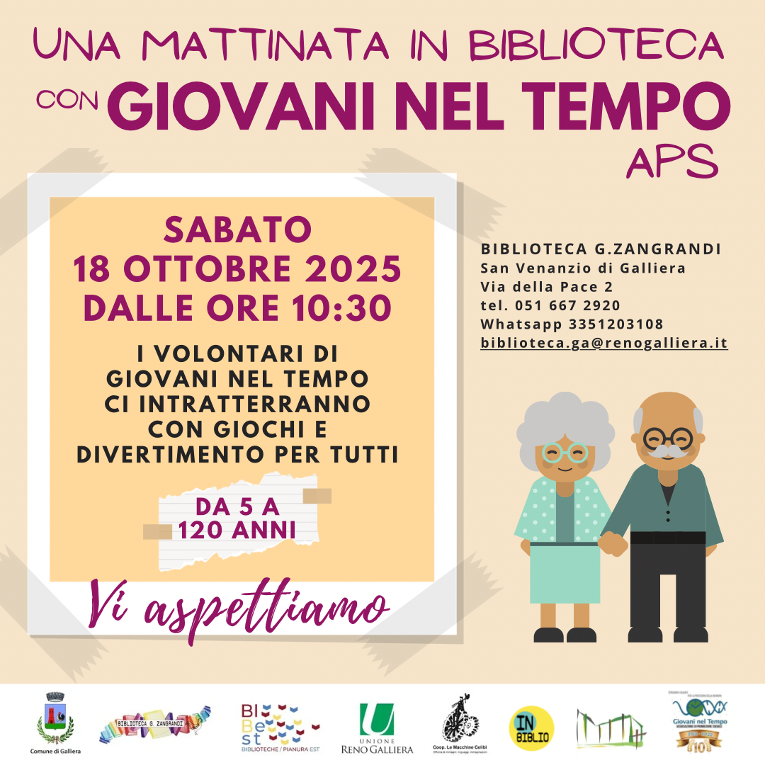 Sabato 18 ottobre dalle ore 10:30 in Biblioteca i volontari di GIOVANI NEL TEMPO ci intratterranno con giochi e divertimento per tutti!