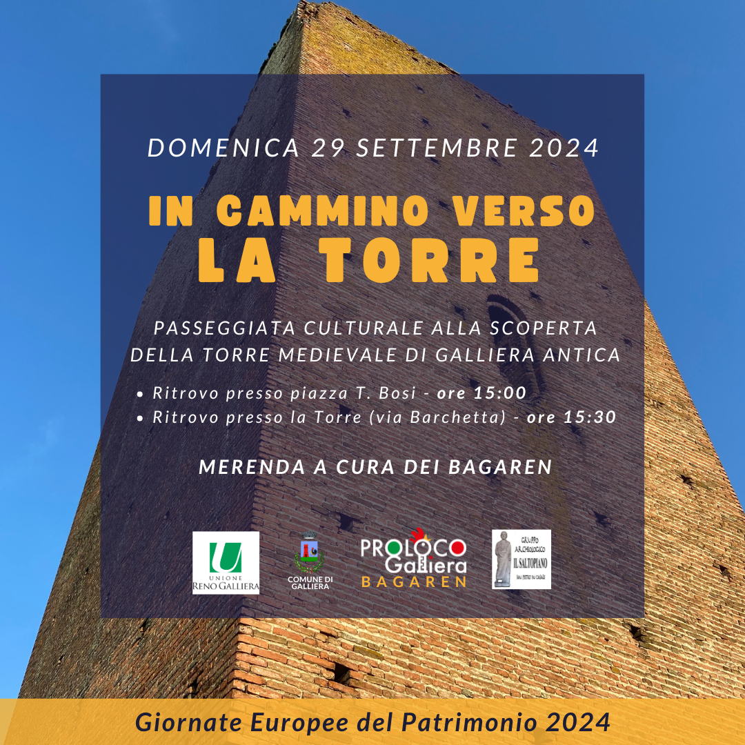 In occasione delle Giornate Europee del Patrimonio domenica 29 settembre 2024 Comune di Galliera, Bagaren, Pro Loco Galliera e Gruppo Archeologico Il Saltopiano organizzano una passeggiata culturale alla scoperta della Torre Medievale di Galliera Antica.