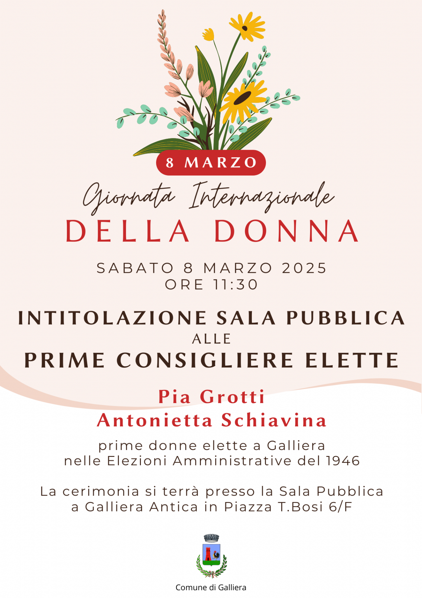 In occasione Giornata Internazionale della Donna della, sabato 8 marzo alle 11:30 si terrà la cerimonia di intitolazione della Sala Pubblica a Galliera Antica in Piazza T. Bosi 6/F a Pia Grotti e Antonietta Schiavina, le prime donne elette a Galliera nelle elezioni amministrative del 1946.