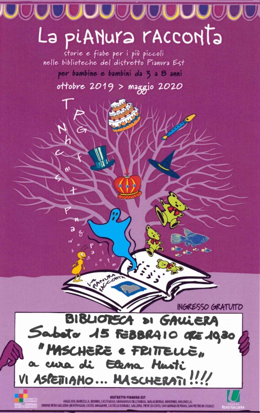 SABATO 15 FEBBRAIO ALLE ORE 10,30 presso la BIBLIOTECA DI GALLIERA,"G.ZANGRANDI" si terrà la lettura animata di "MASCHERE E FRITTELLE": storie fiabe e filastrocche che raccontano la nascita di Arlecchino e del suo vestito multicolore, le avventure di Pulcinella e di altre maschere tipiche del Carnevale! a cura di ELENA MUSTI.