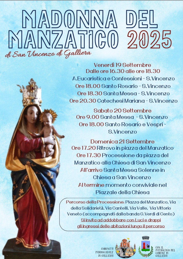 Sulla locandina il programma completo delle celebrazioni, che si concluderanno domenica 21/09 dalle 17:20 con la Processione da Piazza del Manzatico alla Chiesa di San Vincenzo. All'arrivo Santa Messa Solenne e momento conviviale.Costo