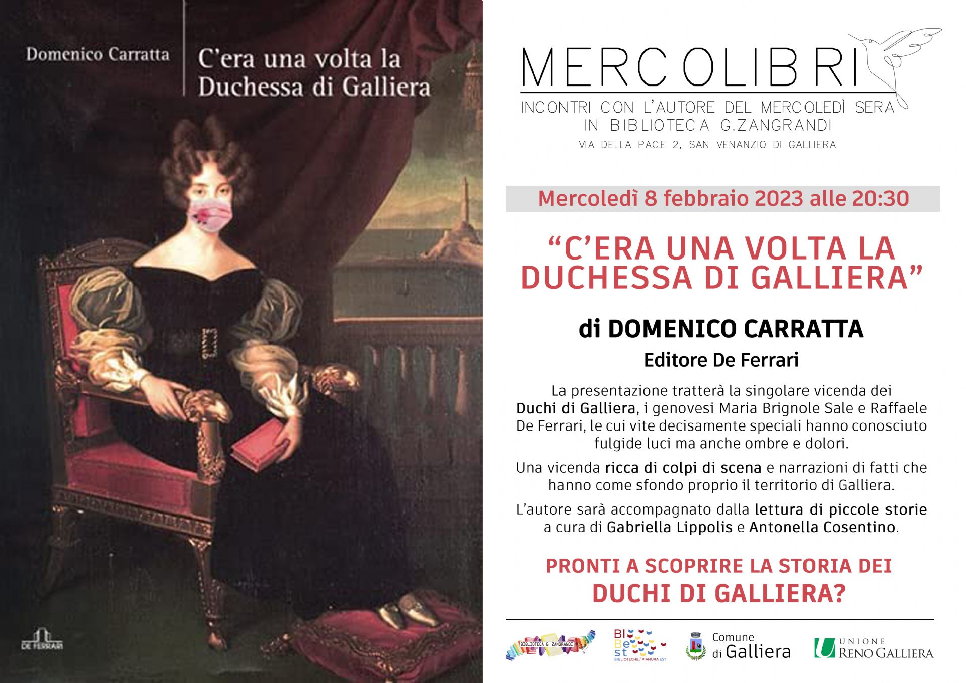 L'appuntamento è mercoledì 8 Febbraio alle 20:30 con Domenico Carratta e il suo libro “C’ERA UNA VOLTA LA DUCHESSA DI GALLIERA”.