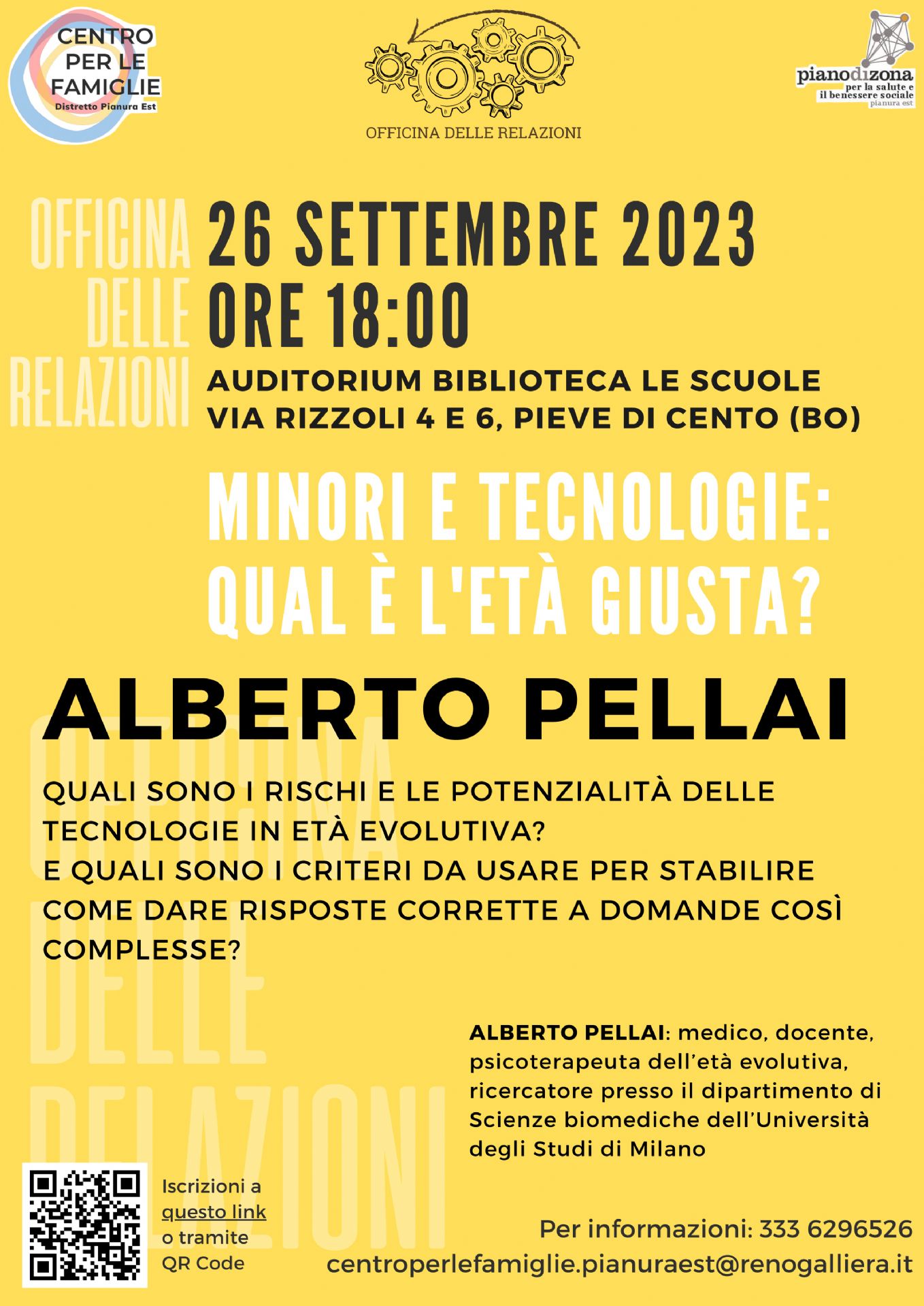 Il primo appuntamento è il 26 settembre 2023 alle ore 18.00 presso l'Auditorium della Biblioteca Le Scuole di Pieve di Cento, con l'incontro - MINORI E TECNOLOGIE: QUAL E' L'ETA' GIUSTA? Ne parleremo con Alberto Pellai medico, docente, psicoterapeuta dell’età evolutiva, ricercatore presso il dipartimento di Scienze biomediche dell’Università degli Studi di Milano, che affronterà il tema con un'attenzione particolare alle conoscenze che discendono dalle neuroscienze, cercando di approfondire rischi e potenzialità delle tecnologie in età evolutiva.