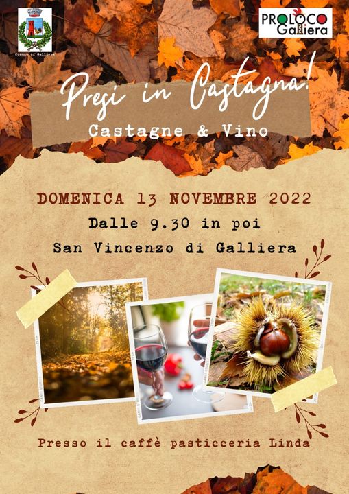 Domenica 13 Novembre 2022 la Pro Loco Galliera vi aspetta presso la Pasticceria Linda a San Vincenzo a partire dalle 9:30 con caldarroste e vino novello.