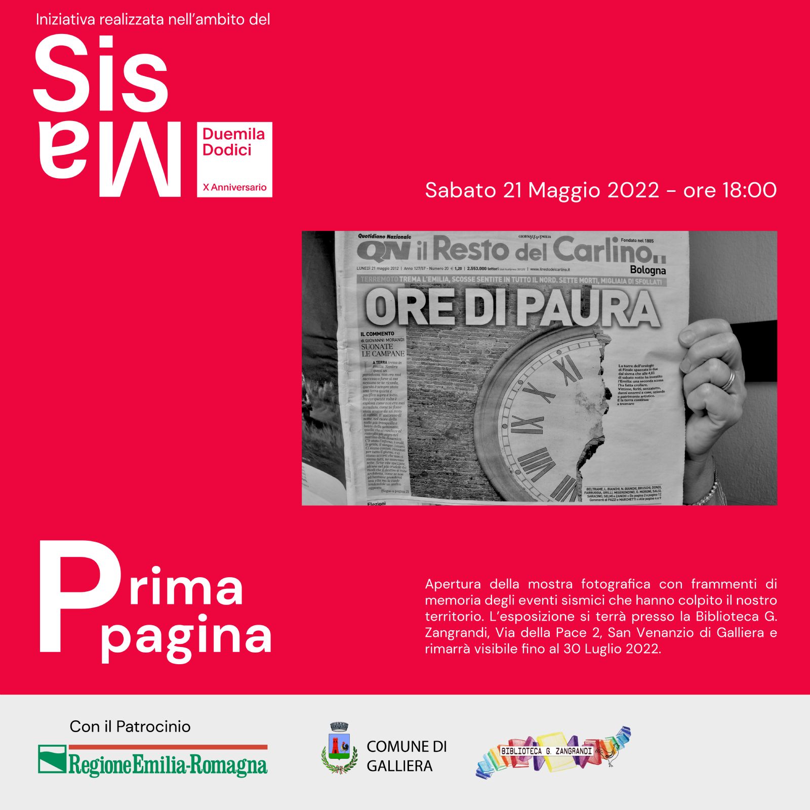 Iniziativa realizzata nell'ambito di "Sisma DuemilaDodici - X Anniversario", con il patrocinio della Regione Emilia Romagna.