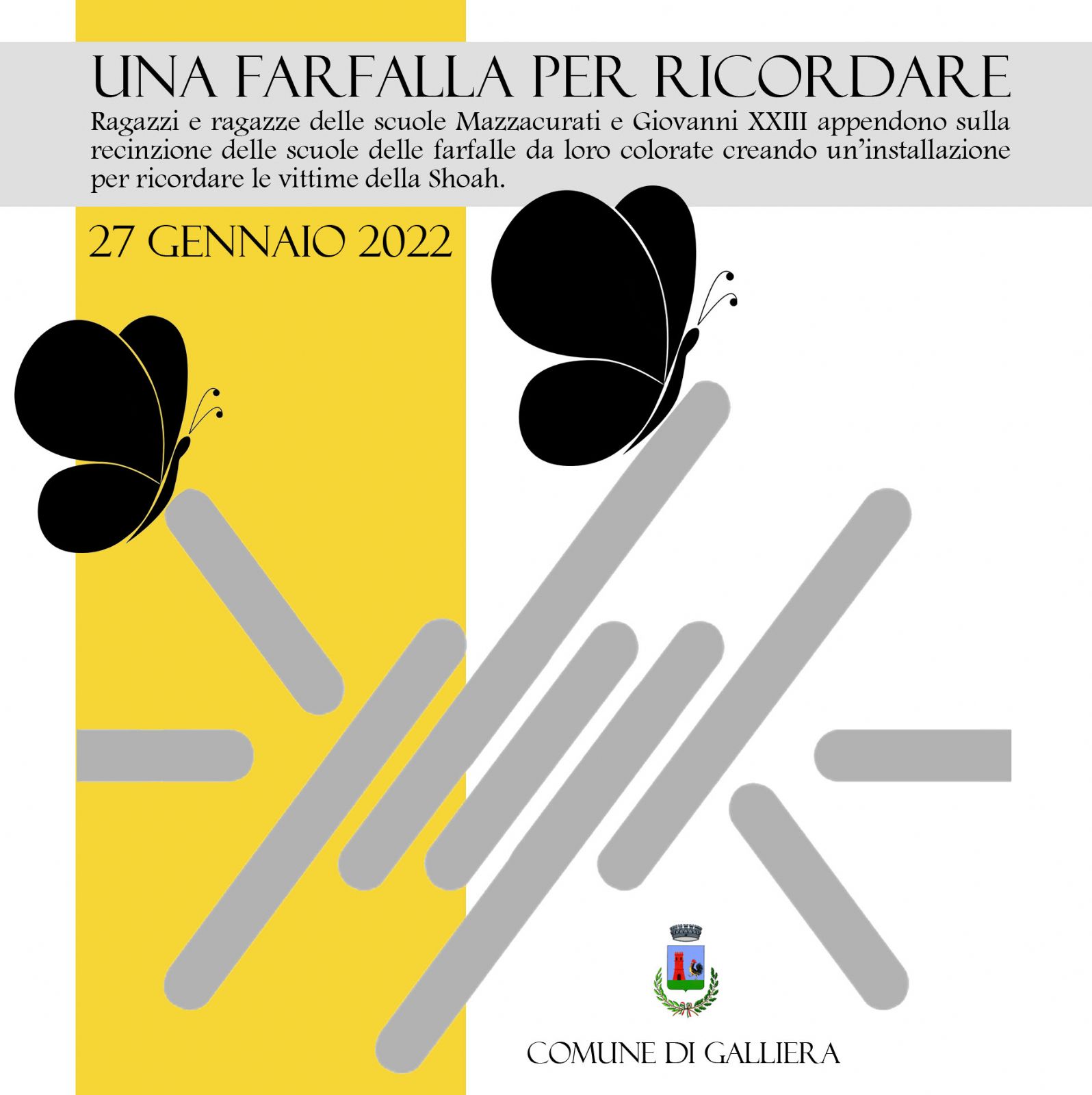 In occasione della Giornata della Memoria, il Comune di Galliera in collaborazione con le scuole Mazzacurati e Giovanni XXIII realizzeranno una installazione dal titolo "UNA FARFALLA PER RICORDARE". Ragazzi e ragazze delle scuole appenderanno sulla recinzione delle loro scuole farfalle da loro colorate in memoria delle vittime della Shoah.