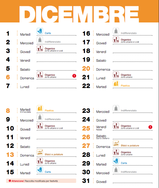 Invitiamo la cittadinanza a prestare attenzione al calendario della raccolta rifiuti porta a porta del mese di dicembre in virtù di alcune variazioni in occasione delle festività!