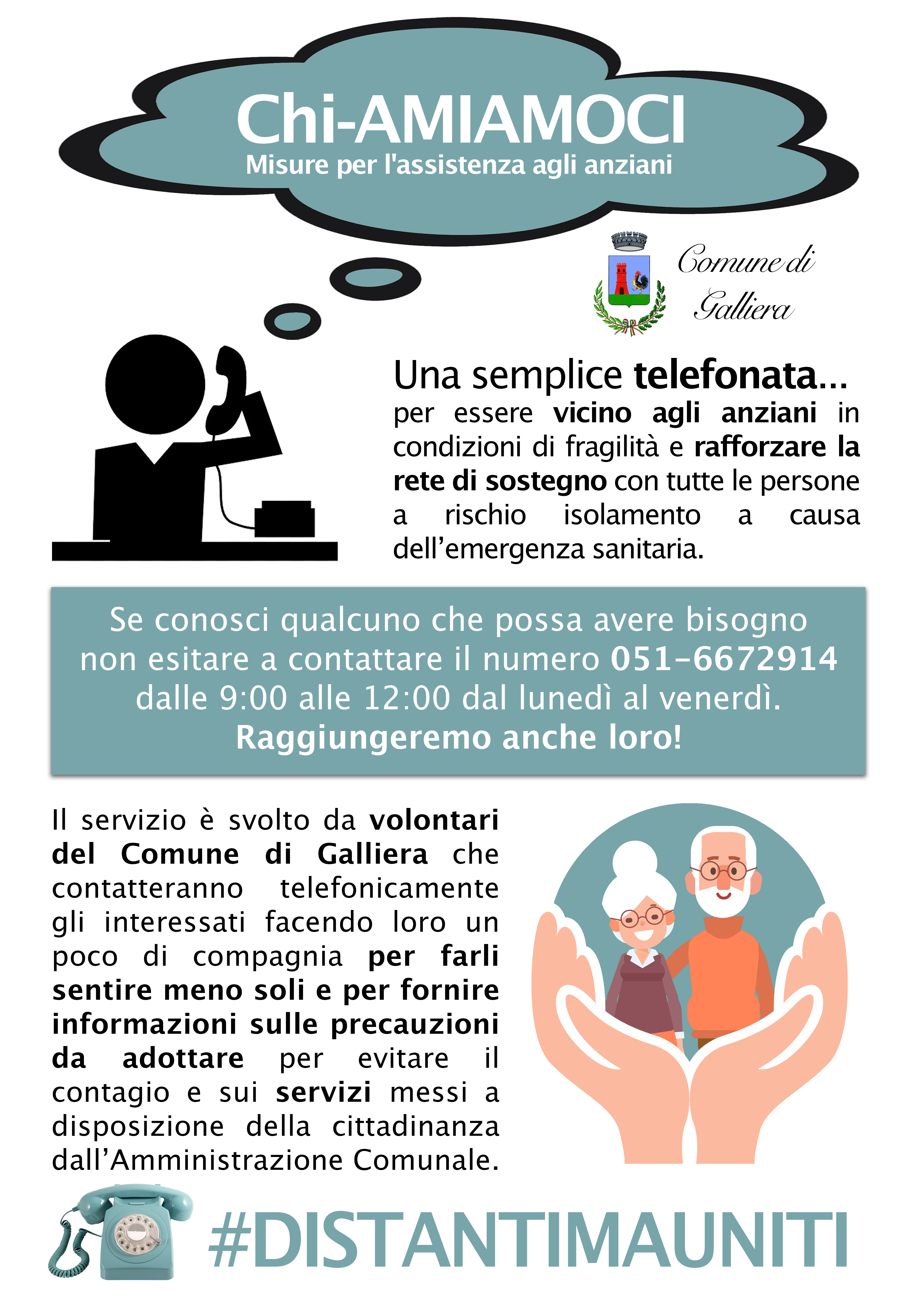 Dimenticarsi delle persone anziane, di coloro che oggi più che mai hanno bisogno del contatto sociale SAREBBE un grave errore: per evitare questo, il Comune di Galliera si prepara a rafforzare la rete di sostegno agli anziani in condizioni di fragilità, intensificando i contatti telefonici con tutte le persone a rischio isolamento a causa di questa emergenza sanitaria.