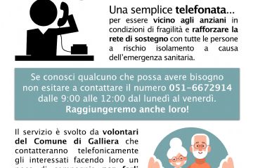 Grazie alla rete di volontariato della comunità di Galliera, le persone a rischio isolamento e i più anziani, saranno raggiunti da una telefonata; gli operatori non solo si accerteranno delle loro condizioni di salute, ma faranno in modo che non si sentano abbandonati; sarà inoltre l’occasione per fornire loro informazioni sulle precauzioni da adottare per evitare il contagio e sui servizi messi a disposizione della cittadinanza dall'Amministrazione Comunale.