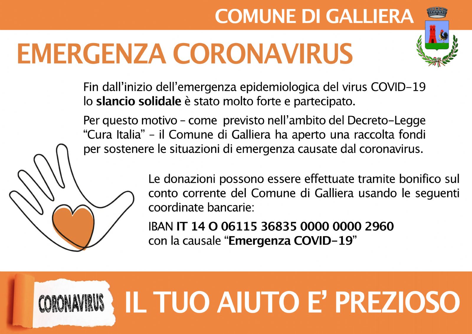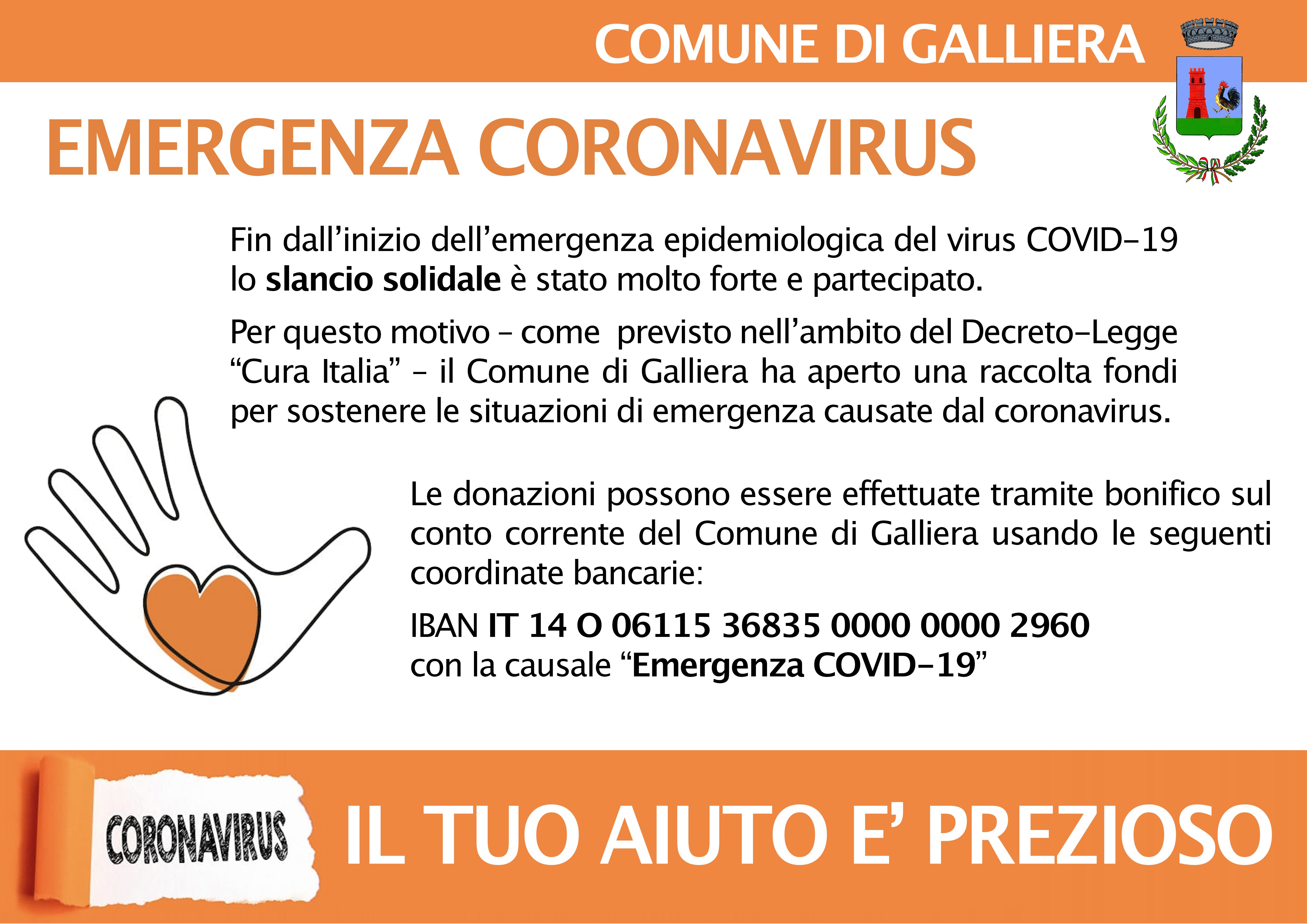 Fin dall’inizio dell’emergenza epidemiologica del virus COVID-19 lo slancio solidale è stato molto forte e partecipato. Per questo motivo – come previsto nell’ambito del Decreto-Legge “Cura Italia” – il Comune di Galliera ha aperto una raccolta fondi per sostenere le situazioni di emergenza causate dal coronavirus.