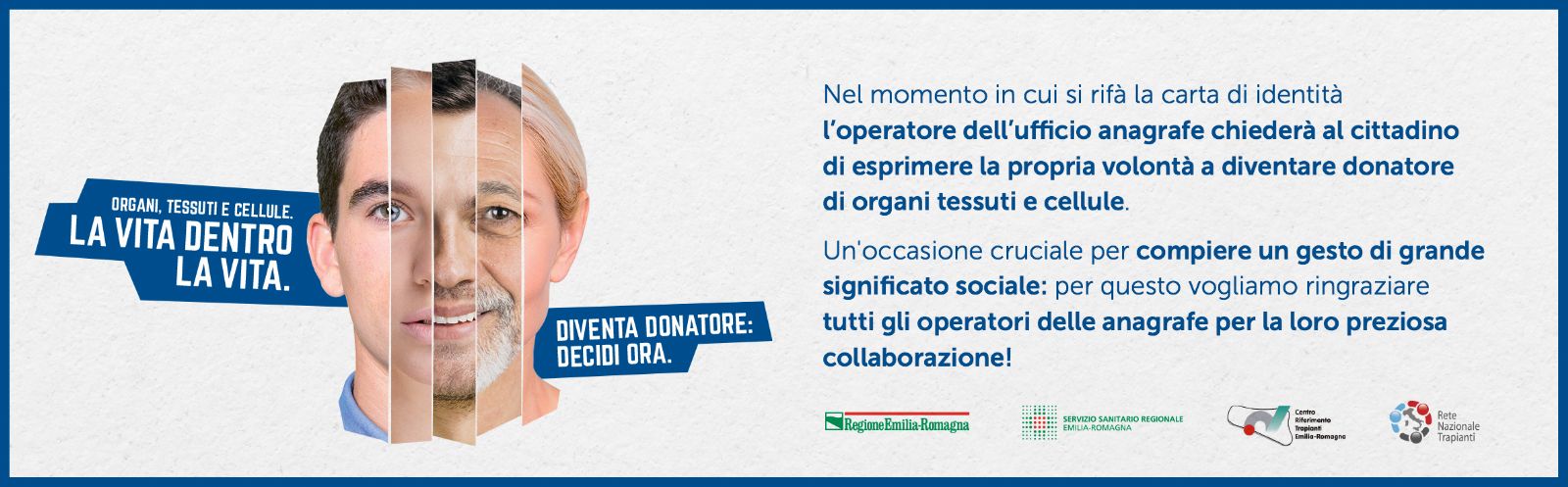 Il Comune – attraverso l’ufficio Anagrafe - riveste un ruolo attivo nell’ambito della DONAZIONE DI ORGANI, dal momento che il rinnovo del documento di identità è per legge la sede dedicata alla raccolta della volontà del cittadino come da art. 3 comma 8 bis della Legge 25/2010 e del successivo art. 43 del D.L. 69/2013 convertito in legge 98/2013.