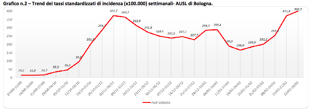 In particolare, si passa da 363,4 casi ogni 100.000 abitanti della settimana 15-21 febbraio ai 399,9 della settimana dal 22 al 28 febbraio (aumento del 10,0%).