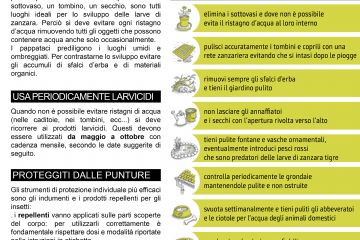 Come lo scorso anno ai cittadini chiediamo di effettuare gli interventi con larvicidi nelle proprie aree private e di mettere in pratica alcune semplici norme di comportamento per evitare il diffondersi del fastidioso insetto.
