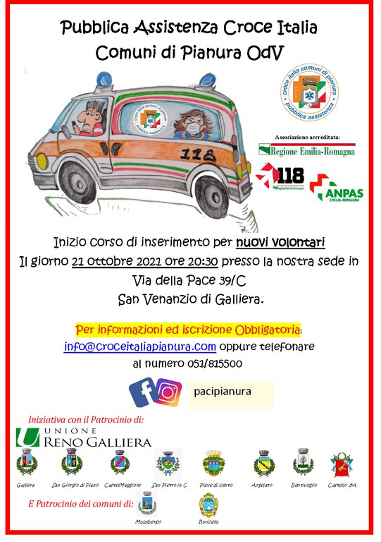 L'associazione Croce Italia Comuni di Pianura propone, con il patrocinio dell'unione Reno Galliera, un corso di inserimento per nuovi volontari