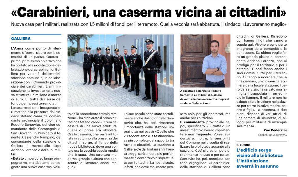 "Grazie al Tg3 Emilia Romagna, TRC Bologna e Il Resto del Carlino per aver preso parte alla Conferenza stampa indetta questa mattina in Municipio a Galliera per presentare la nuova Caserma dei Carabinieri di Galliera.