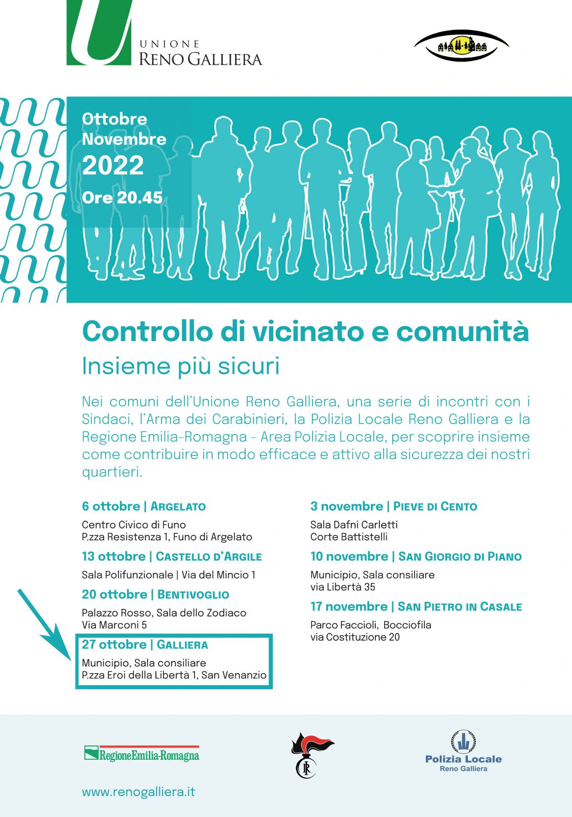 Nei comuni dell’Unione Reno Galliera, una serie di incontri con i Sindaci, l’Arma dei Carabinieri, la Polizia Locale Reno Galliera e la Regione Emilia-Romagna - Area Polizia Locale, per scoprire insieme come contribuire in modo efficace e attivo alla sicurezza dei nostri quartieri.