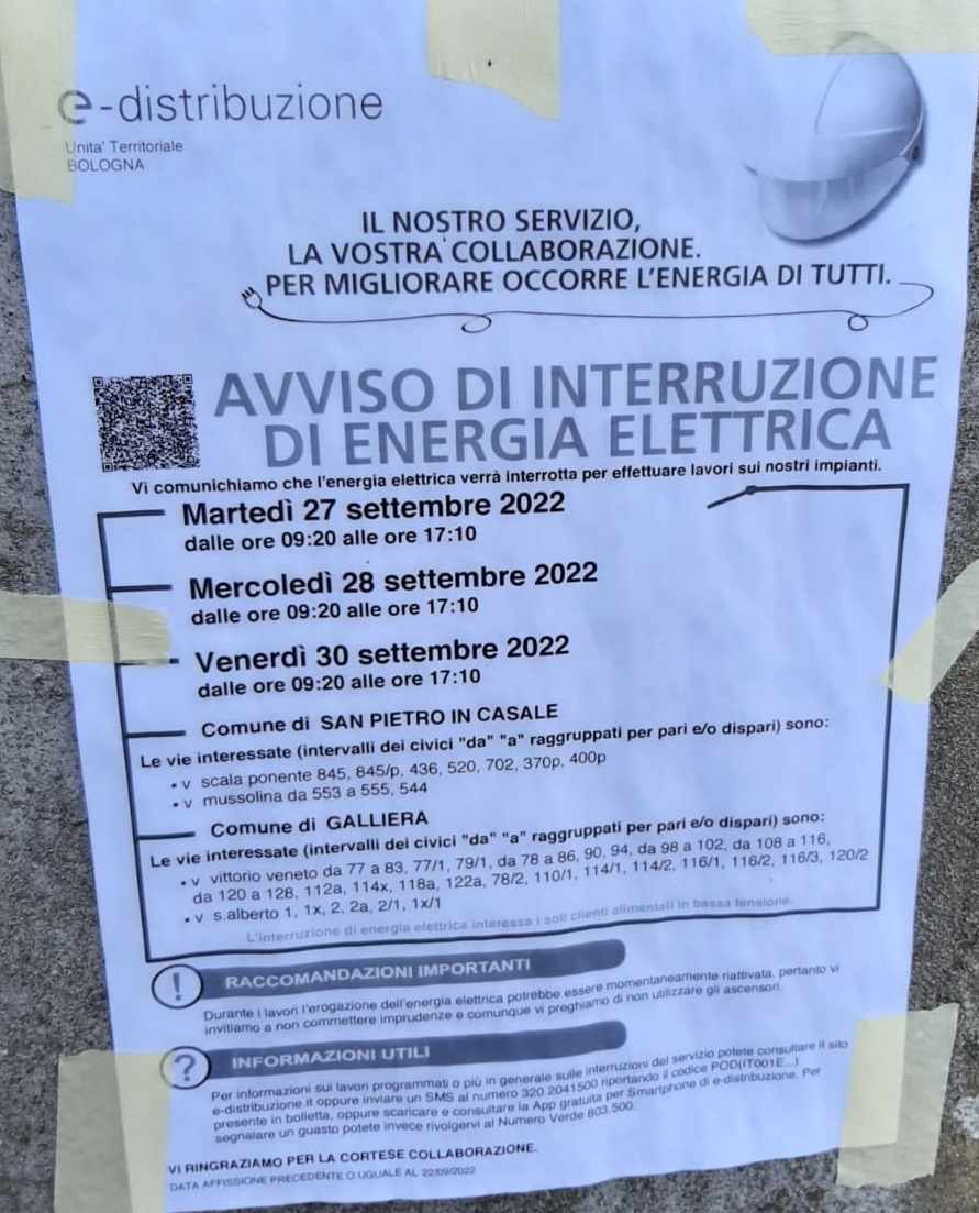 E-distribuzione comunica con affissione dei volantini nelle vie interessate che, causa lavori alla rete elettrica, nella giornate di: