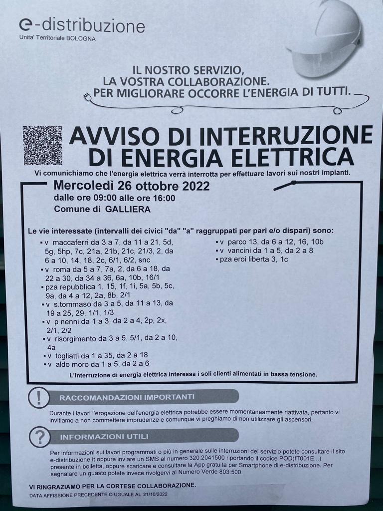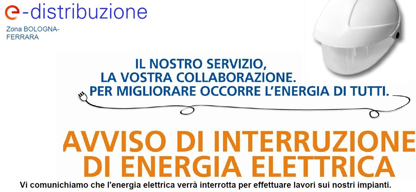 E-distribuzione ci comunica che, causa lavori alla rete elettrica, nella giornata di mercoledì 26 ottobre 2022 dalle ore 09:00 alle ore 16:00 sarà interrotta l'energia elettrica nelle seguenti vie: