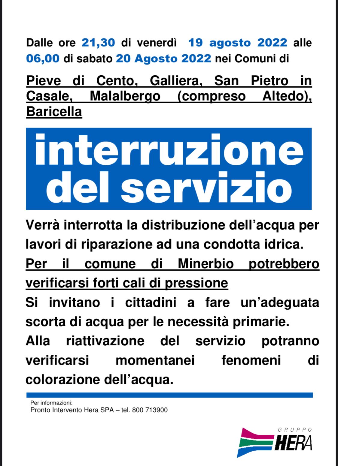 Nella notte tra Venerdì 19/08/2022 e Sabato 20/08/2022 (dalle ore 21,30 alle 6,00) Hera effettuerà dei lavori per la riparazione di una importante condotta idrica in via Olmo nel territorio del Comune di Bentivoglio.