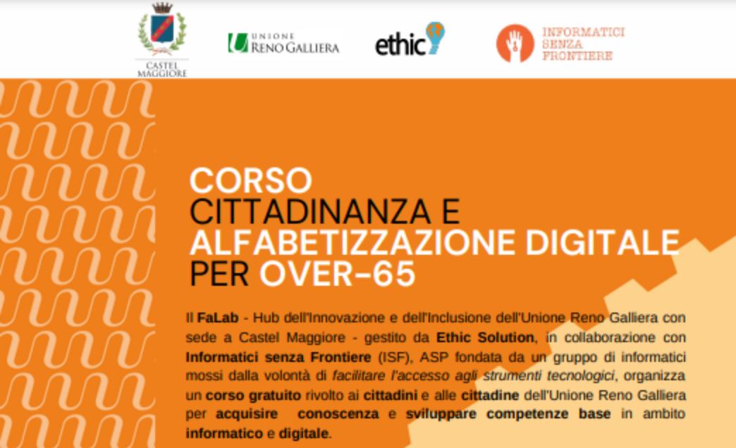 Il FaLab organizza un corso gratuito rivolto ai cittadini e alle cittadine dell'Unione Reno Galliera che abbiano più di 65 anni e vogliano sviluppare competenze di base in ambito informatico e digitale.
