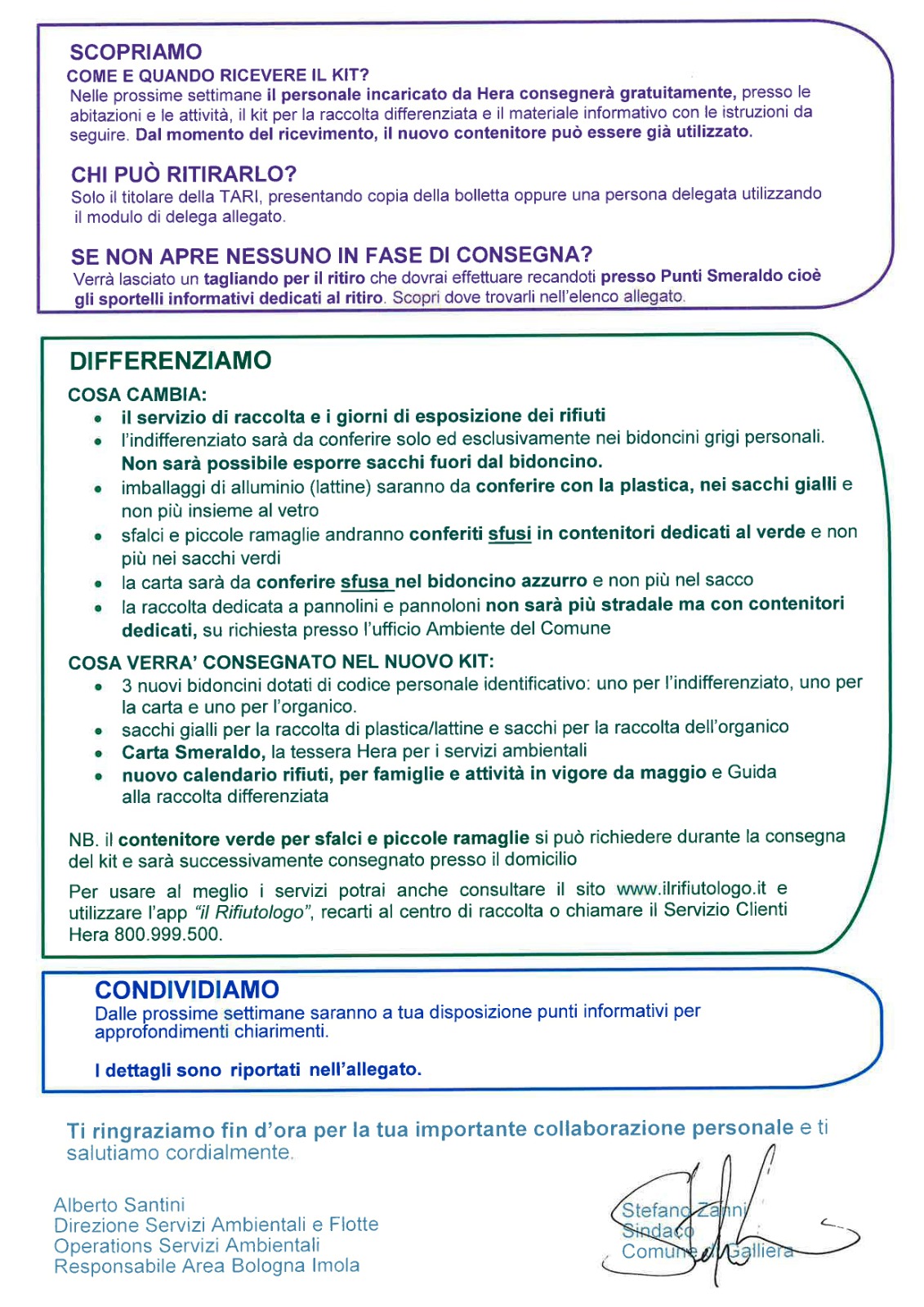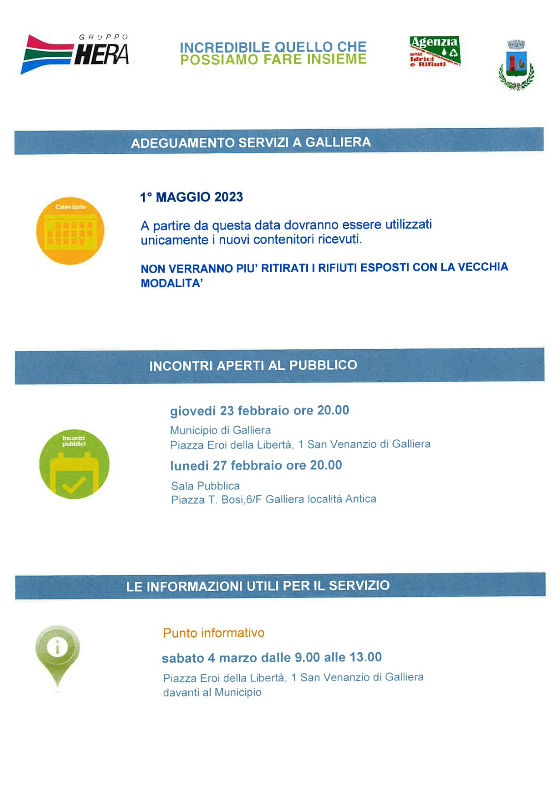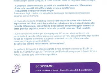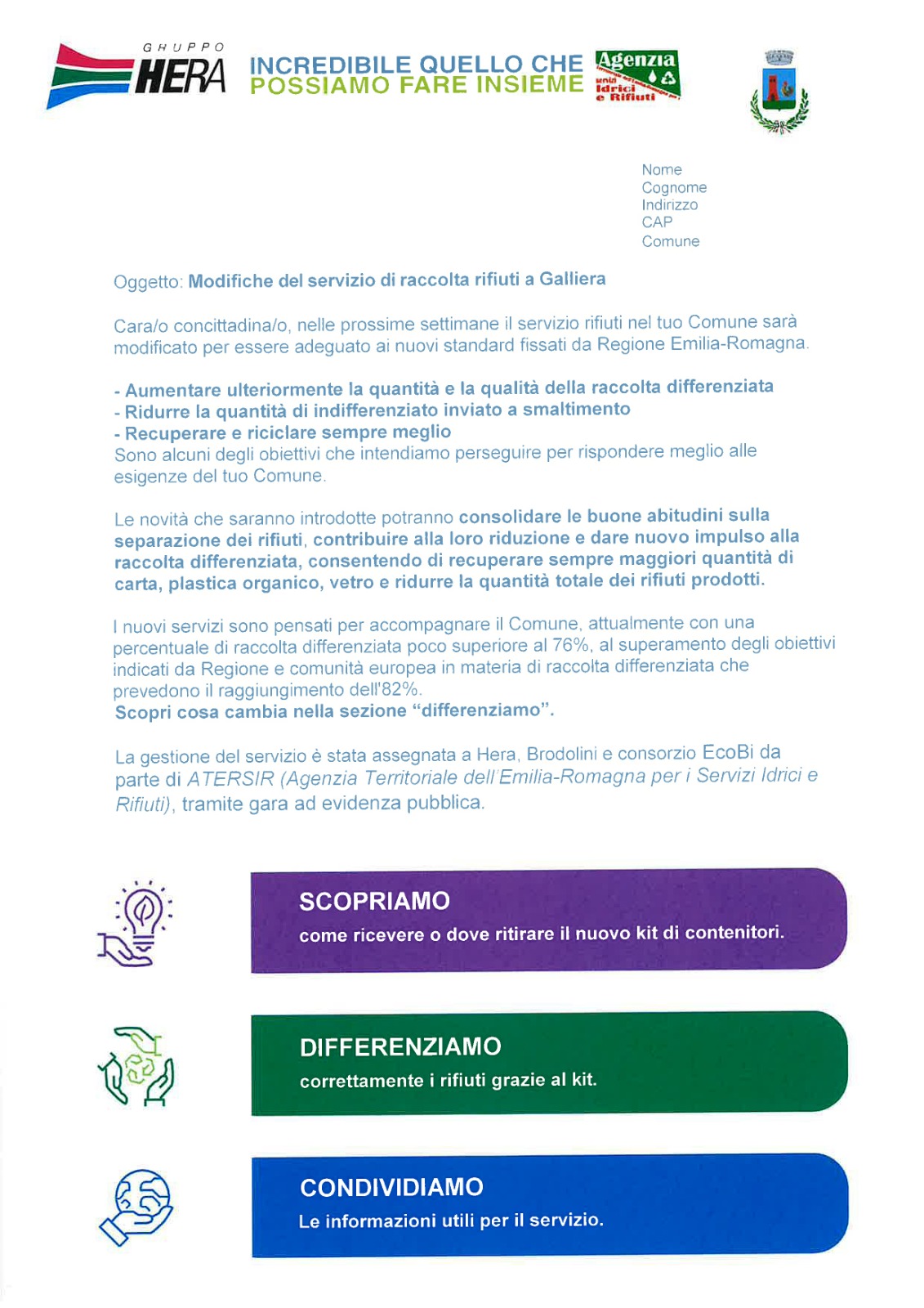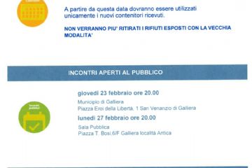 Si informa la cittadinanza che è in consegna in questi giorni, nel Comune di Galliera, una lettera contenente informazioni relative a modifiche nel sistema di raccolta rifiuti; tali modifiche si rendono necessarie al fine di adeguare il sistema di raccolta dei rifiuti ai nuovi standard regionali ed entreranno in vigore dal 1 Maggio 2023.