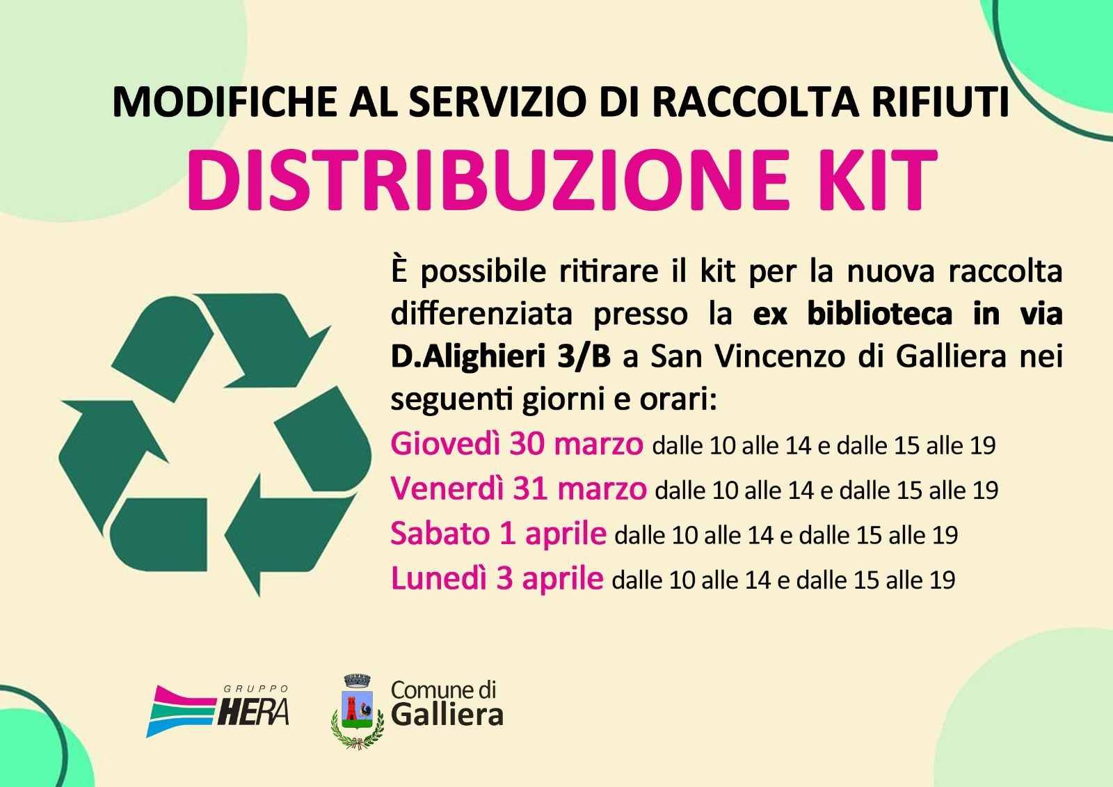 Qualora non foste a casa verrà rilasciato un tagliandino e sarà possibile ritirare il kit presso la ex biblioteca in via D.Alighieri 3/B a San Vincenzo di Galliera dalle 10 alle 14 e dalle 15 alle 19