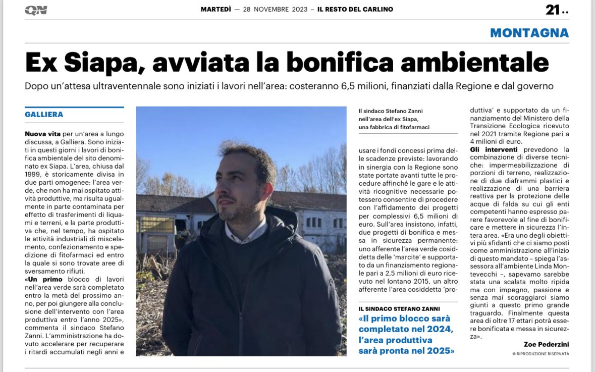 Articolo de "Il Resto del Carlino" in cui si parla dell’avvio dei lavori di bonifica ambientale e messa in sicurezza permanente dell’area ex-Siapa.