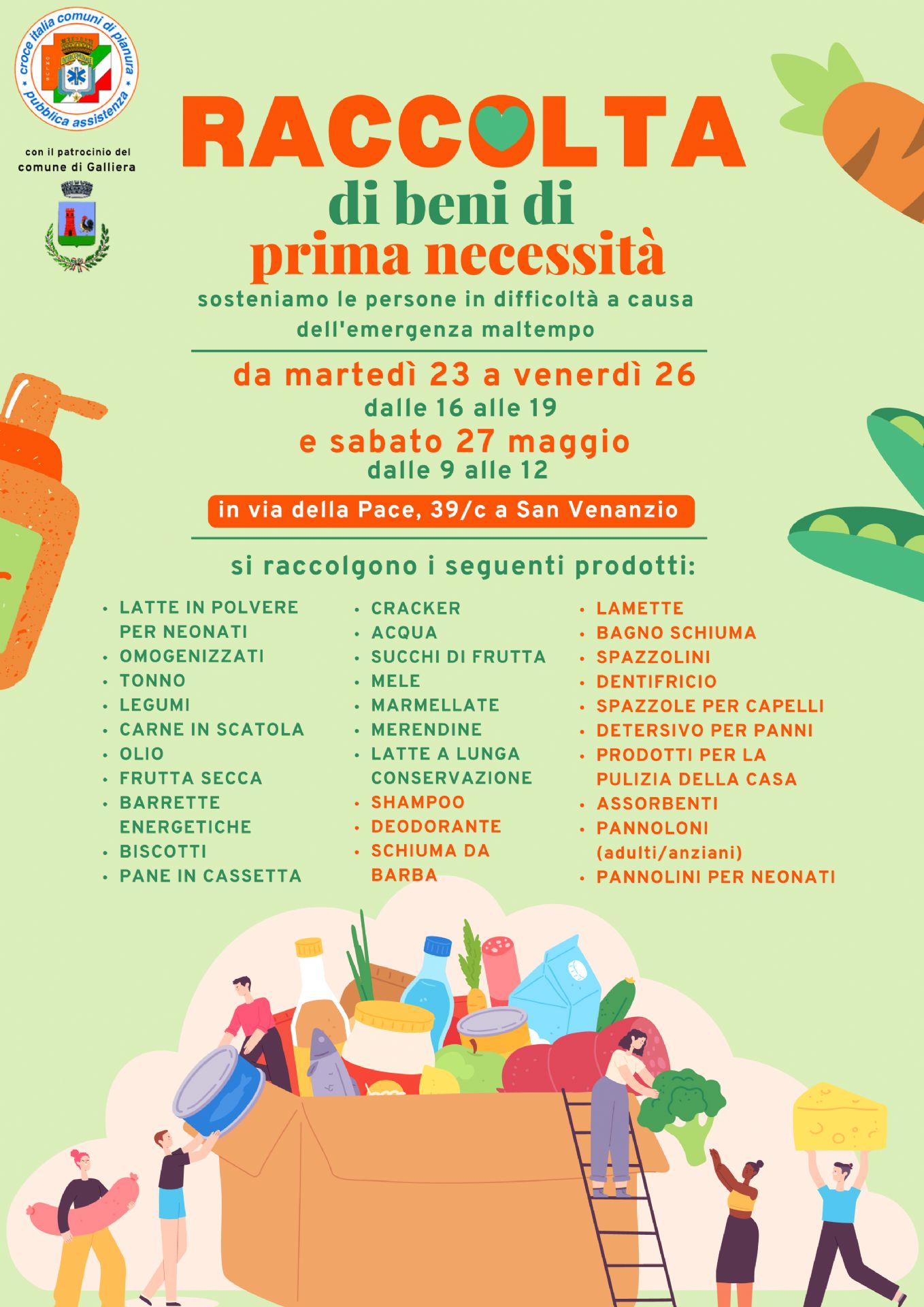 Croce Italia Comuni di Pianura con il Patrocinio del Comune di Galliera sostiene le persone in difficoltà a causa dell'emergenza maltempo con una raccolta di beni.