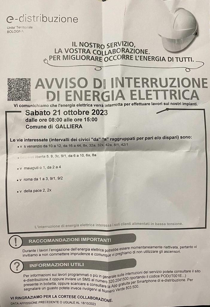 E-distribuzione ci comunica che, causa lavori alla rete elettrica, nella giornata di