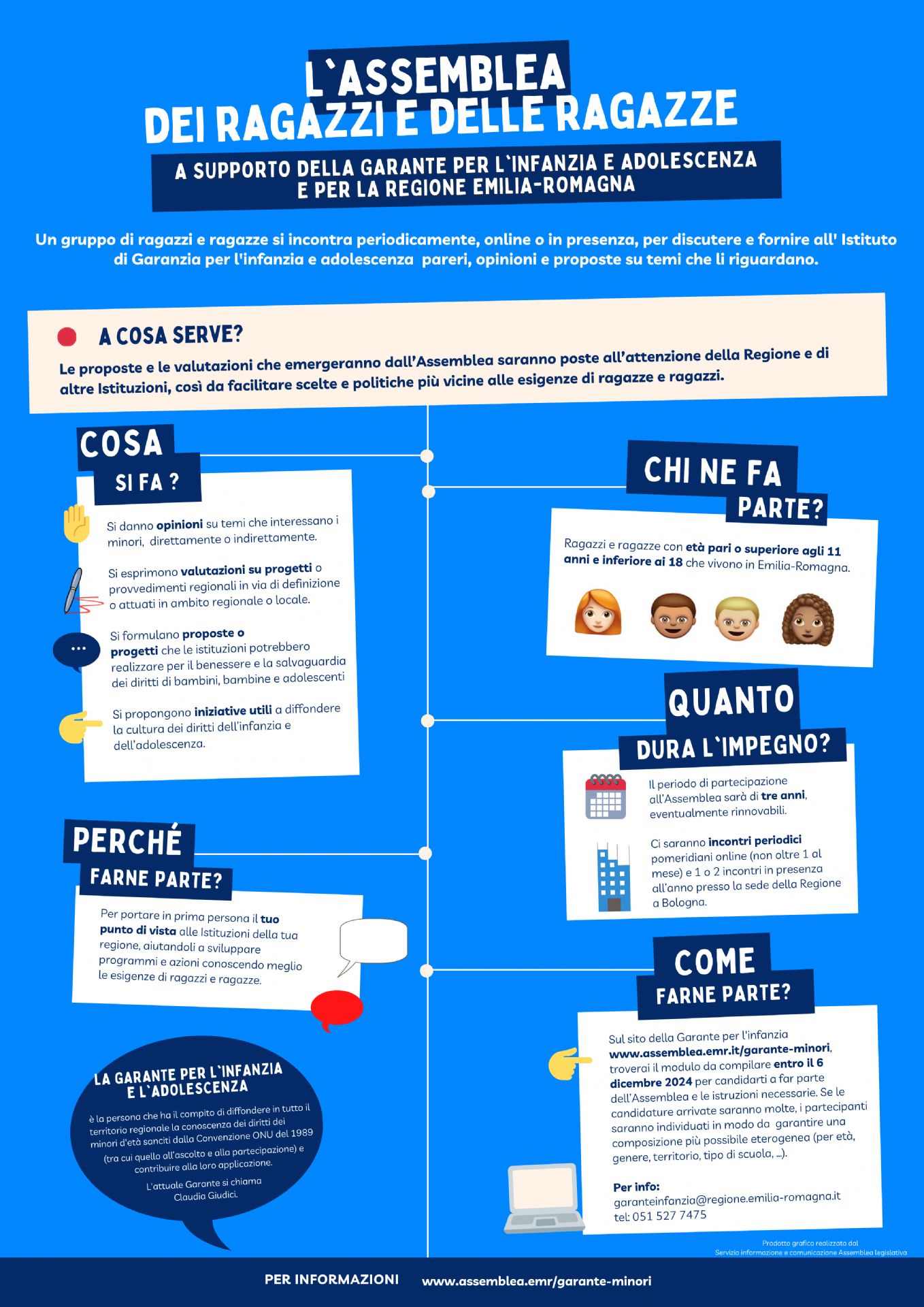 La Regione Emilia-Romagna, attraverso la Garante per l’infanzia e l’adolescenza, apre le candidature per costituire l’Assemblea delle ragazze e dei ragazzi per il triennio 2025-2027. L’Assemblea avrà il compito di promuovere la partecipazione attiva di giovani residenti o domiciliati/e sul territorio regionale nella definizione e valutazione delle politiche pubbliche che li/le riguardano.