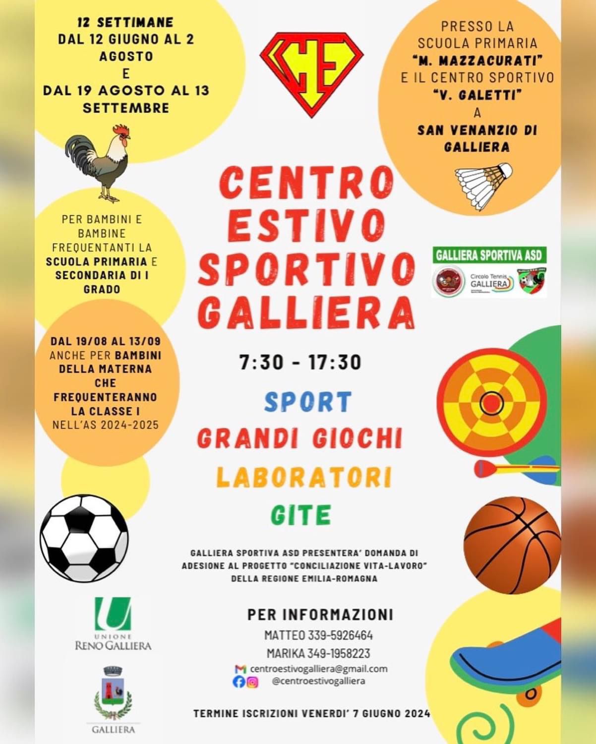 Domande: 𝗱𝗮𝗹 𝟬𝟳 𝗺𝗮𝗴𝗴𝗶𝗼 𝟮𝟬𝟮𝟰 𝗮𝗹 𝟳 𝗴𝗶𝘂𝗴𝗻𝗼 𝟮𝟬𝟮𝟰 in forma telematica inviando la modulistica all’indirizzo email centroestivogalliera@gmail.com o tramite consegna a mano a partire da sabato 11 maggio, tutti i sabati presso il centro sportivo – palazzetto dello sport dalle ore 9.30 alle ore 12.30.