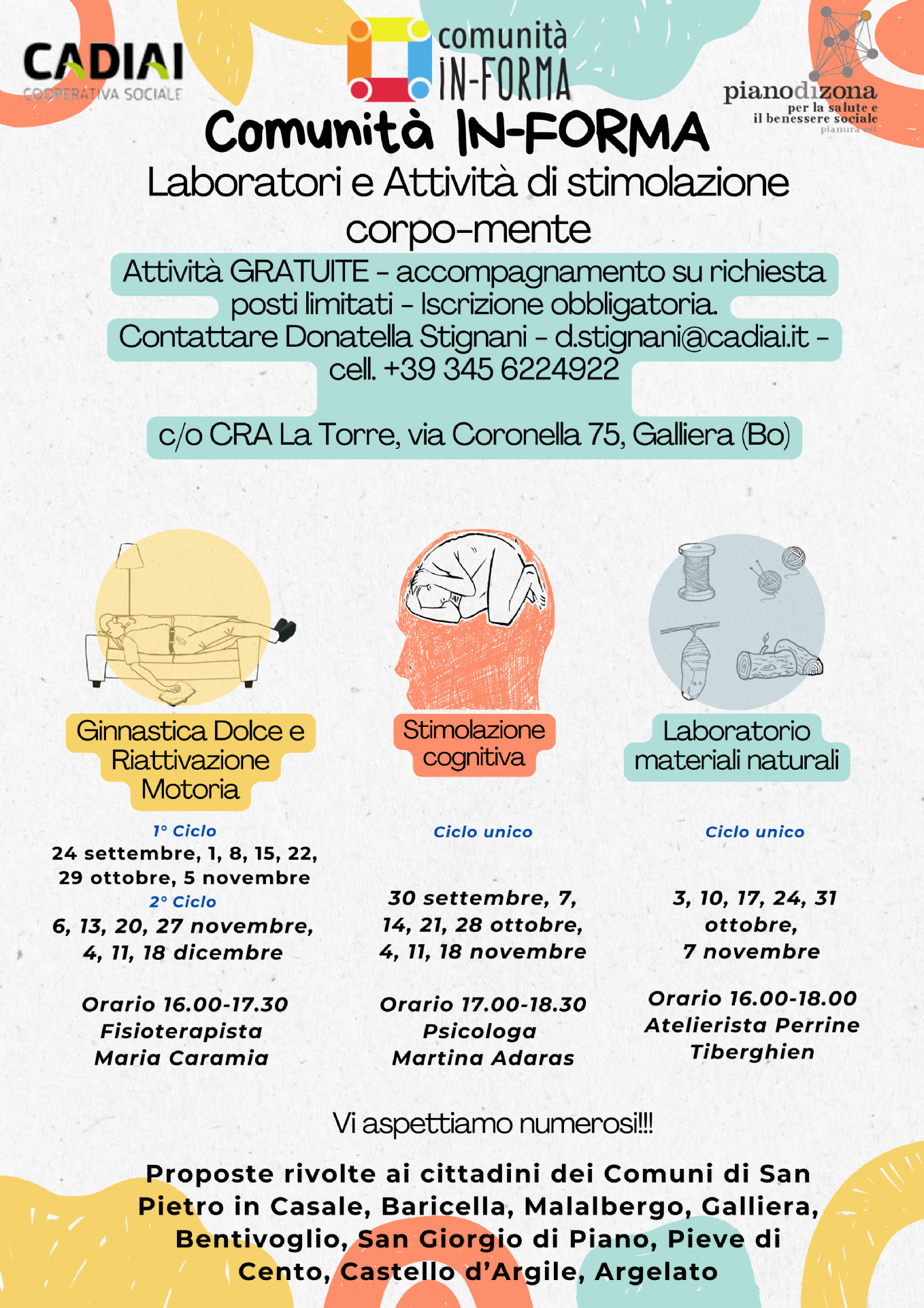 CADIAI Cooperativa Sociale, nell'ambito del progetto Comunità IN-Forma, organizza percorsi laboratoriali e attività a favore di cittadini fragili dei Comuni della Pianura Est.