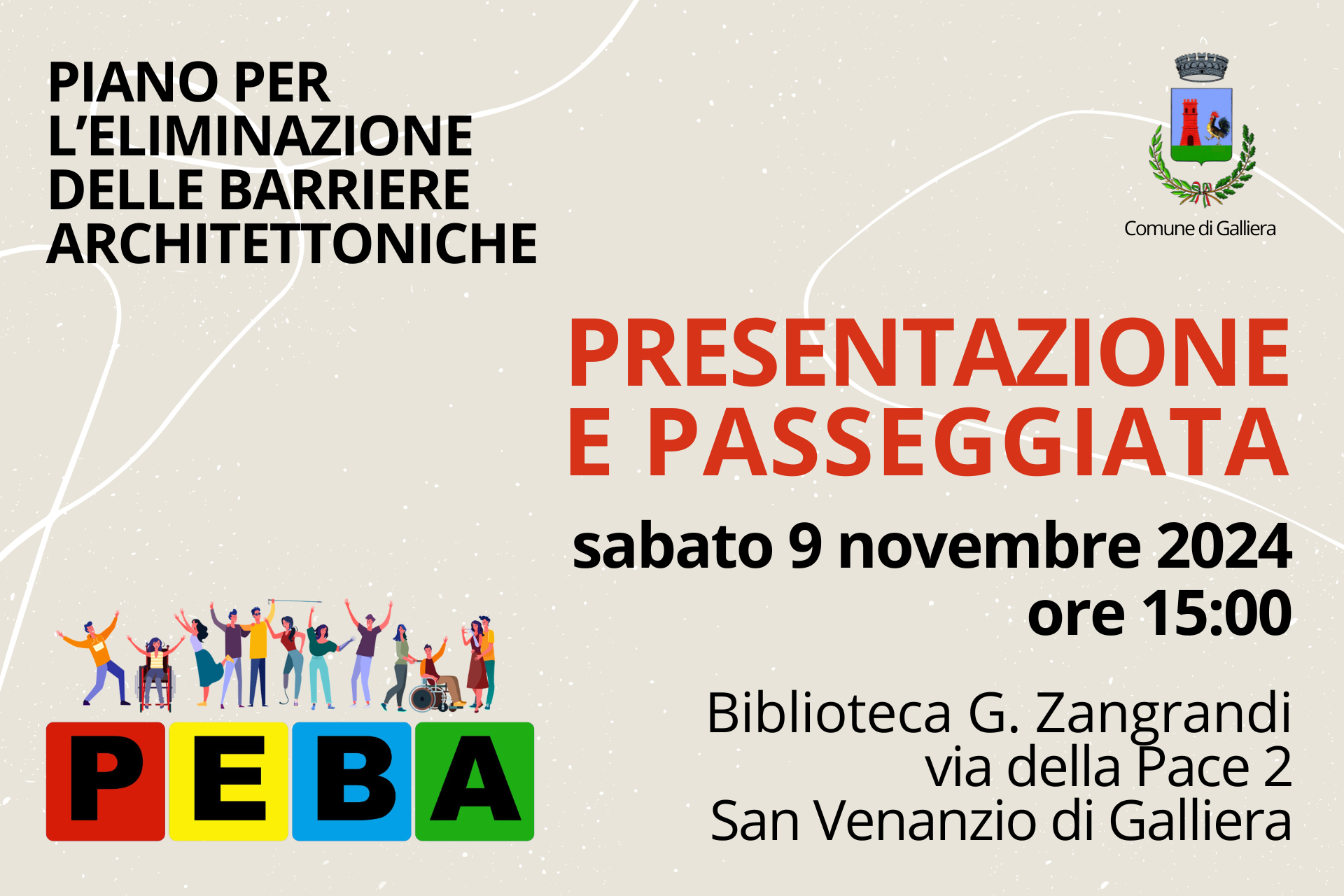 Ora vi invitiamo a partecipare ad un nuovo incontro pubblico di presentazione del P.E.B.A Sabato 9 novembre 2024 alle ore 15:00 presso la Biblioteca G. Zangrandi, via della Pace 2 – San Venanzio di Galliera.