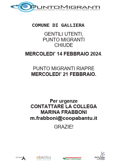 Si comunica che il Punto Migranti resterà chiuso MERCOLEDI’ 14 FEBBRAIO 2024 e riaprirà MERCOLEDI’ 21 FEBBRAIO.