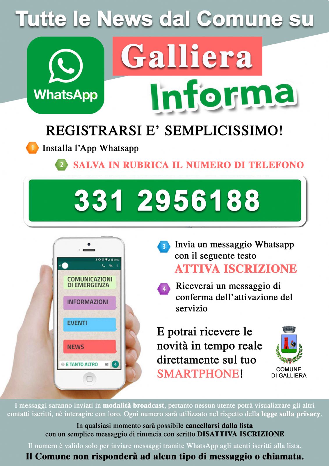 - Inviare un messaggio Whatsapp con scritto ATTIVA ISCRIZIONE.