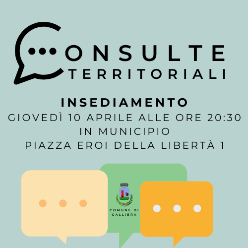 Giovedì 10 aprile 2025 alle 20:30, nella sala consigliare “Giovanni Falcone e Paolo Borsellino” del Municipio di Galliera - Piazza Eroi della Libertà 1 si svolgerà l'insediamento delle tre consulte territoriali di: