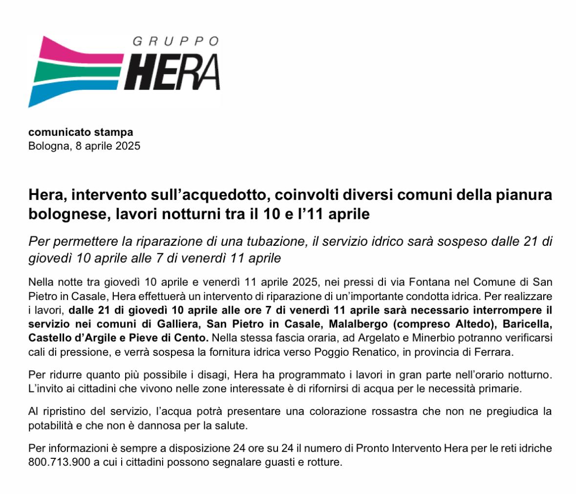 Nella notte tra giovedì 10 aprile e venerdì 11 aprile 2025, nei pressi di via Fontana nel Comune di San Pietro in Casale, Hera effettuerà un intervento di riparazione di un’importante condotta idrica. Per realizzare i lavori, dalle 21 di giovedì 10 aprile alle ore 7 di venerdì 11 aprile sarà necessario interrompere il servizio nei comuni di Galliera, San Pietro in Casale, Malalbergo (compreso Altedo), Baricella, Castello d’Argile e Pieve di Cento. Nella stessa fascia oraria, ad Argelato e Minerbio potranno verificarsi cali di pressione, e verrà sospesa la fornitura idrica verso Poggio Renatico, in provincia di Ferrara.