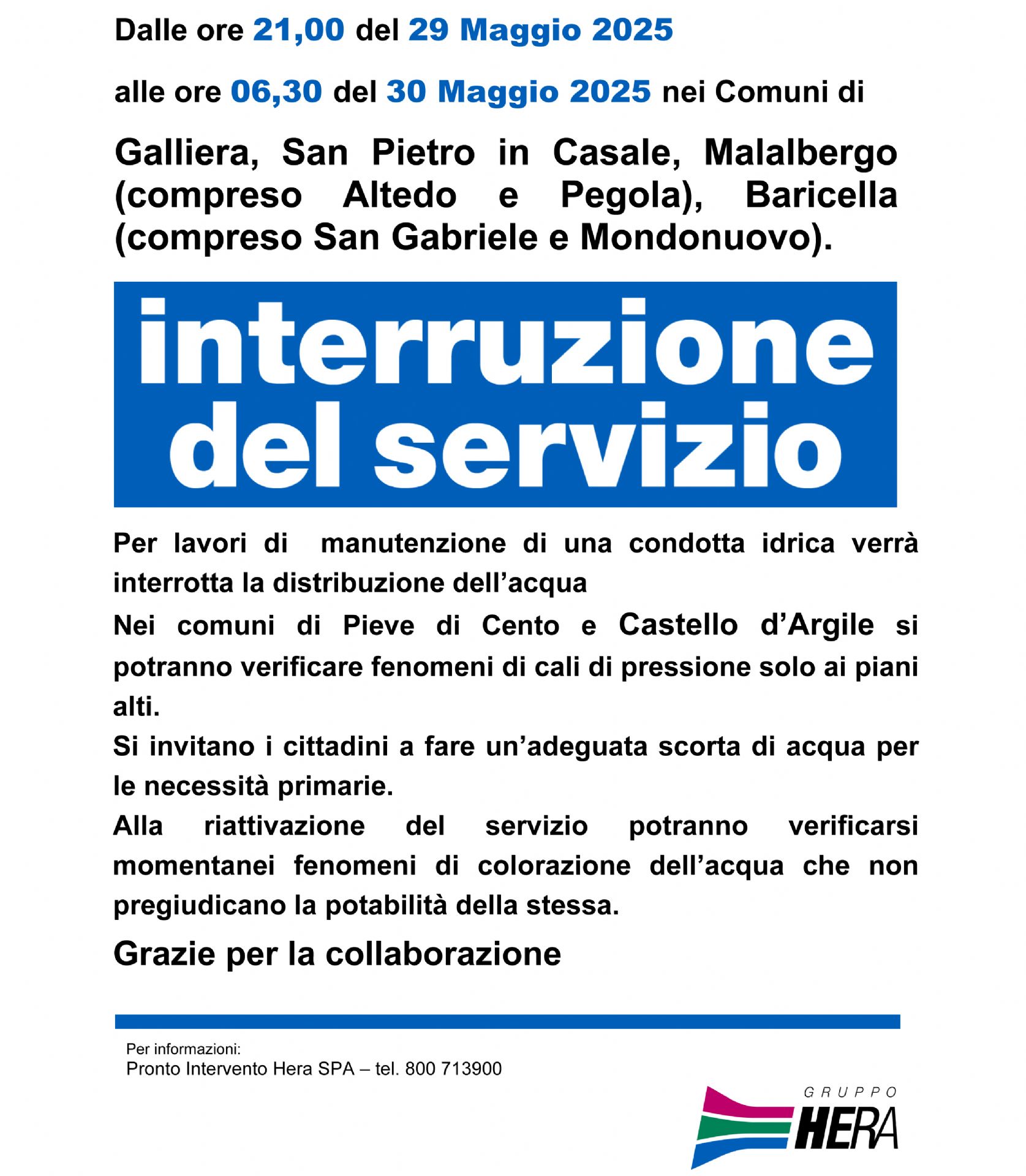 Per mettere in funzione la nuova rete, il servizio idrico sarà sospeso dalle 21 di giovedì 29 maggio alle 6.30 di venerdì 30 maggio nei territori di Galliera, San Pietro in Casale, Malalbergo (comprese le frazioni di Altedo e Pegola), Baricella (comprese San Gabriele e Mondonuovo). Probabili cali di pressione a Pieve di Cento e Castello d’Argile.